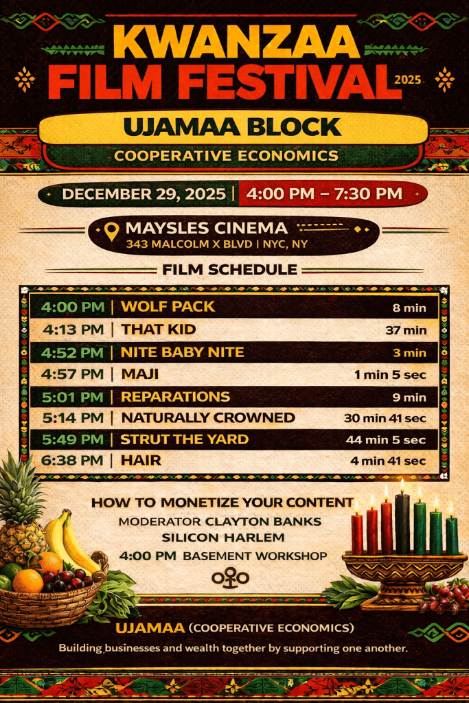 We have just received the official flyer for our screening next Monday at the Kwanzaa Film Festival in NYC. It’s going to be several days full of events, but the Ujamaa Block is when our new film, “Hair” will premiere. If you’re in New York City during the holiday season, you can purchase a ticket to be there and witness us close out Day 4 of the festival.